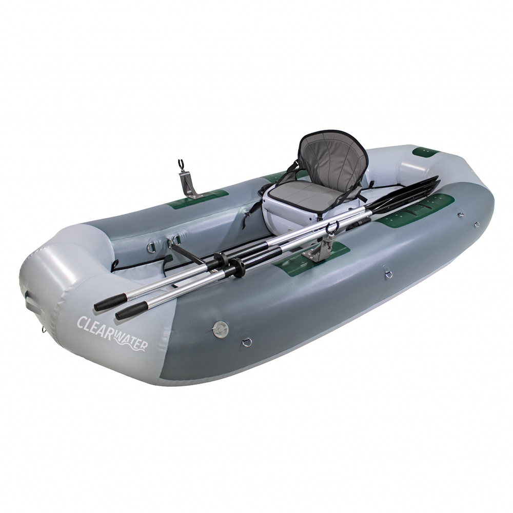 OSG Clearwater is ready for big water and lots of gear. Using the open oarlock system, perfected on some of our multi-person rafts, it can accommodate longer/stronger oars for conditions when you need to put more oomph into your stroke. The Clearwater has a trampoline style cargo space in front and back for securing lots of gear. It has a 450 lbs load capacity but weighs in at just under 35 lbs. The high-back seat rests on an inflatable thwart so the rower has great visibility and making it great for longer days on the water and even short expedition trips. Bonus, no trailer is needed and will fit in the bed of pick-up or can be car-topped for easy transport to your next fishing spot.